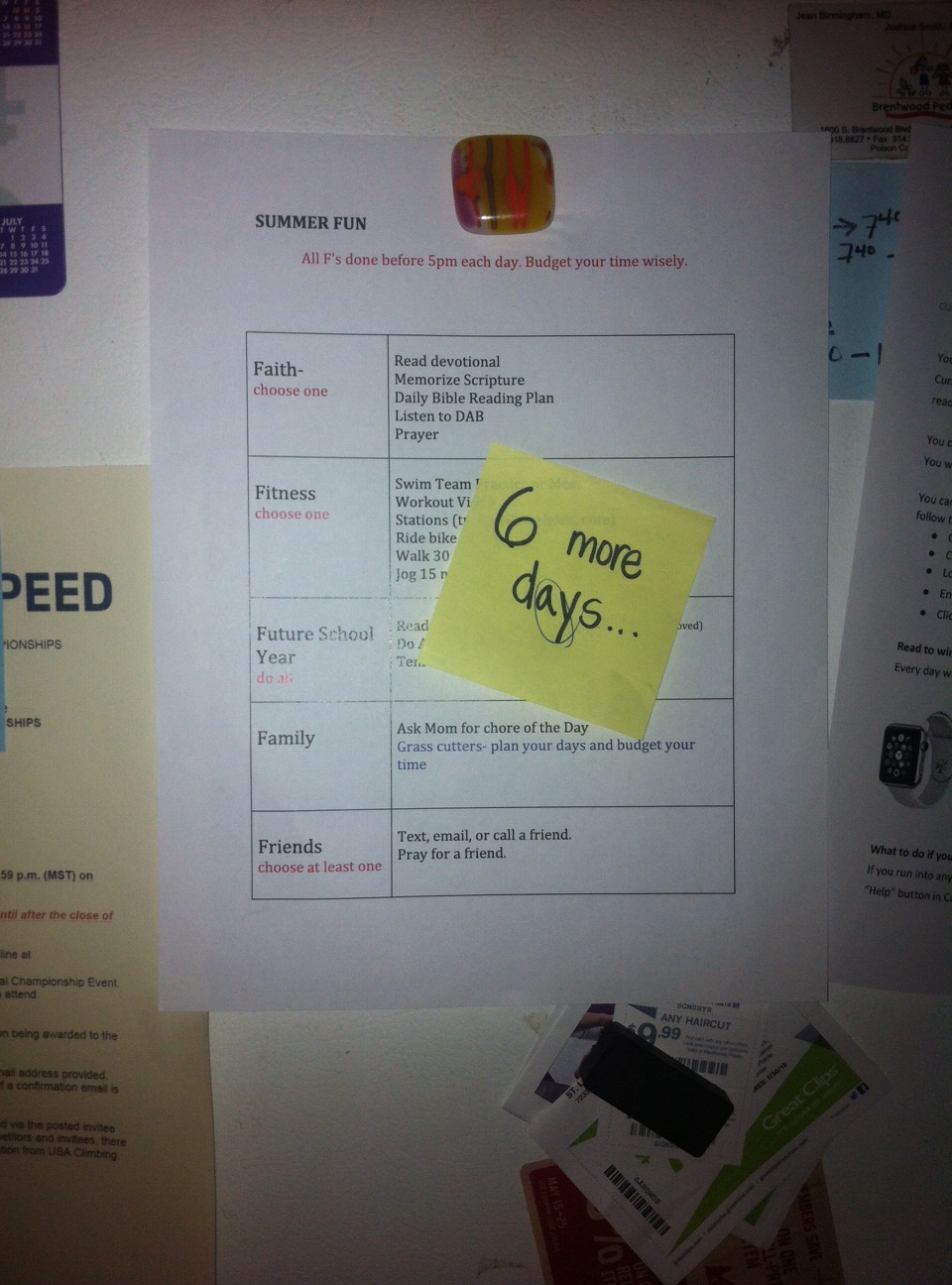 Right when school lets out, I put this chart on our refrigerator with a post-it counting down the days until the summer plan goes into effect.